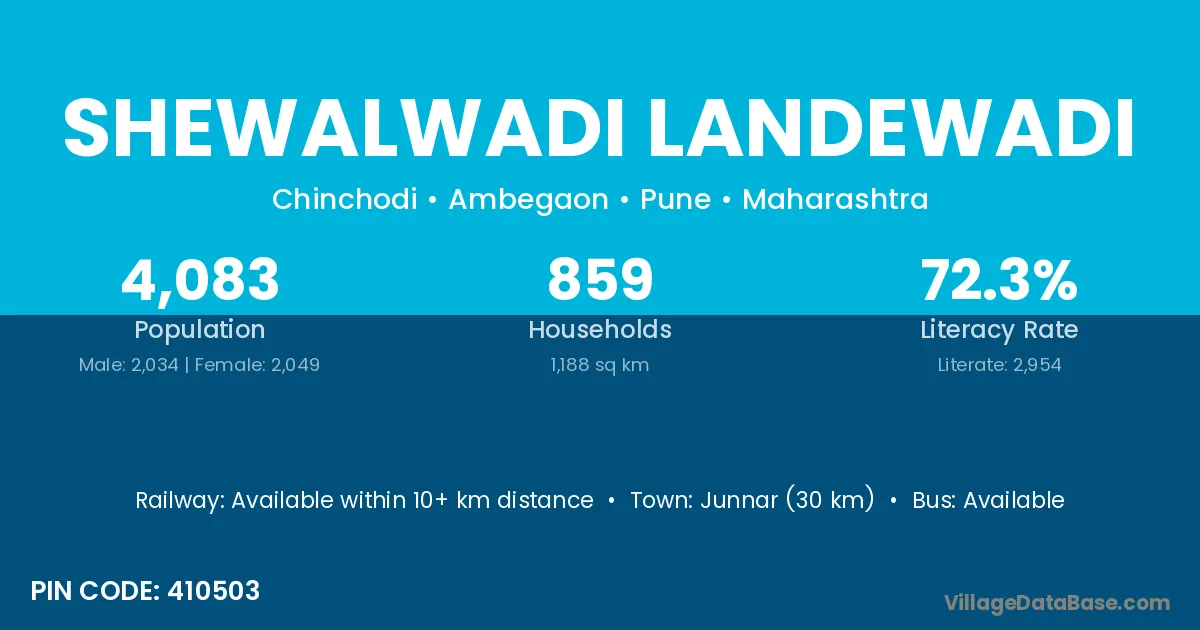 Junnar (30 km) is the nearest town to Shewalwadi Landewadi village for major economic activities and is located approximately 30 km away.