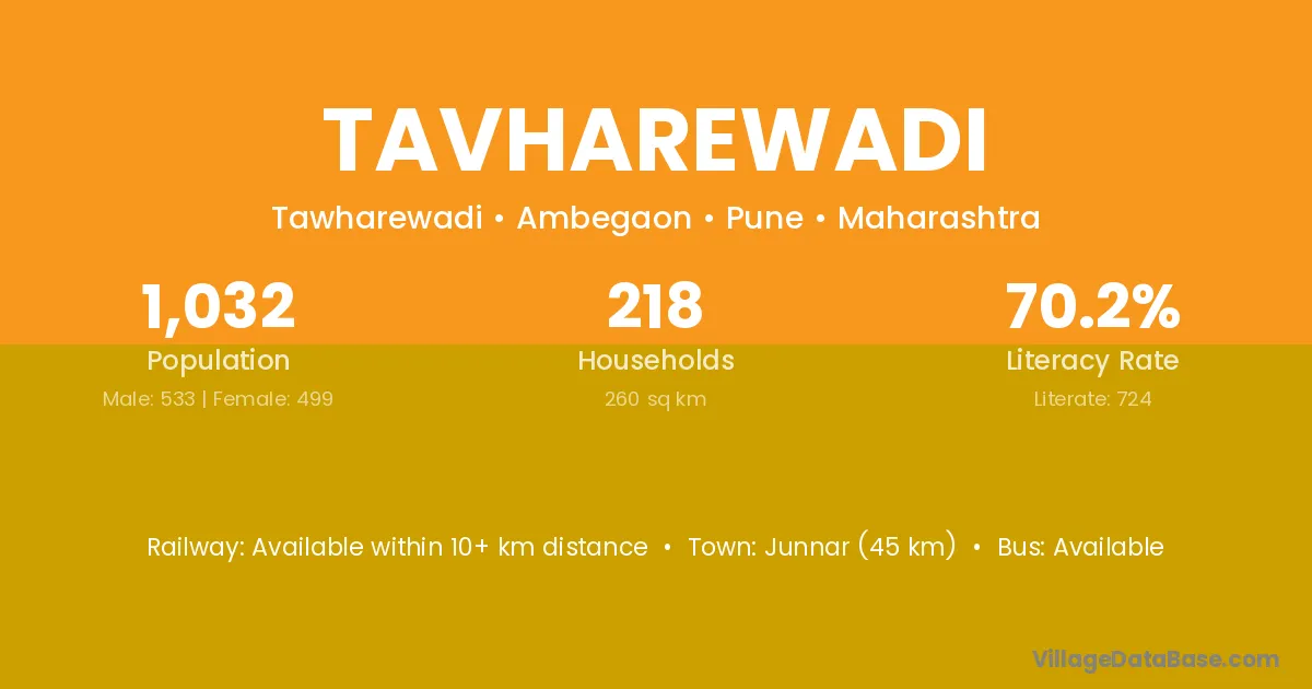 Tavharewadi village has a total population of 1,032 people, of which 533 are males and 499 are females.