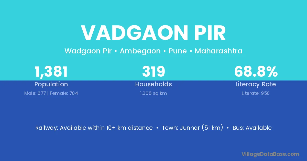 Junnar (51 km) is the nearest town to Vadgaon Pir village for major economic activities and is located approximately 51 km away.