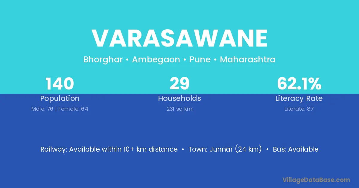 Junnar (24 km) is the nearest town to Varasawane village for major economic activities and is located approximately 24 km away.