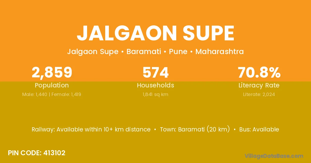 Baramati (20 km) is the nearest town to Jalgaon Supe village for major economic activities and is located approximately 20 km away.