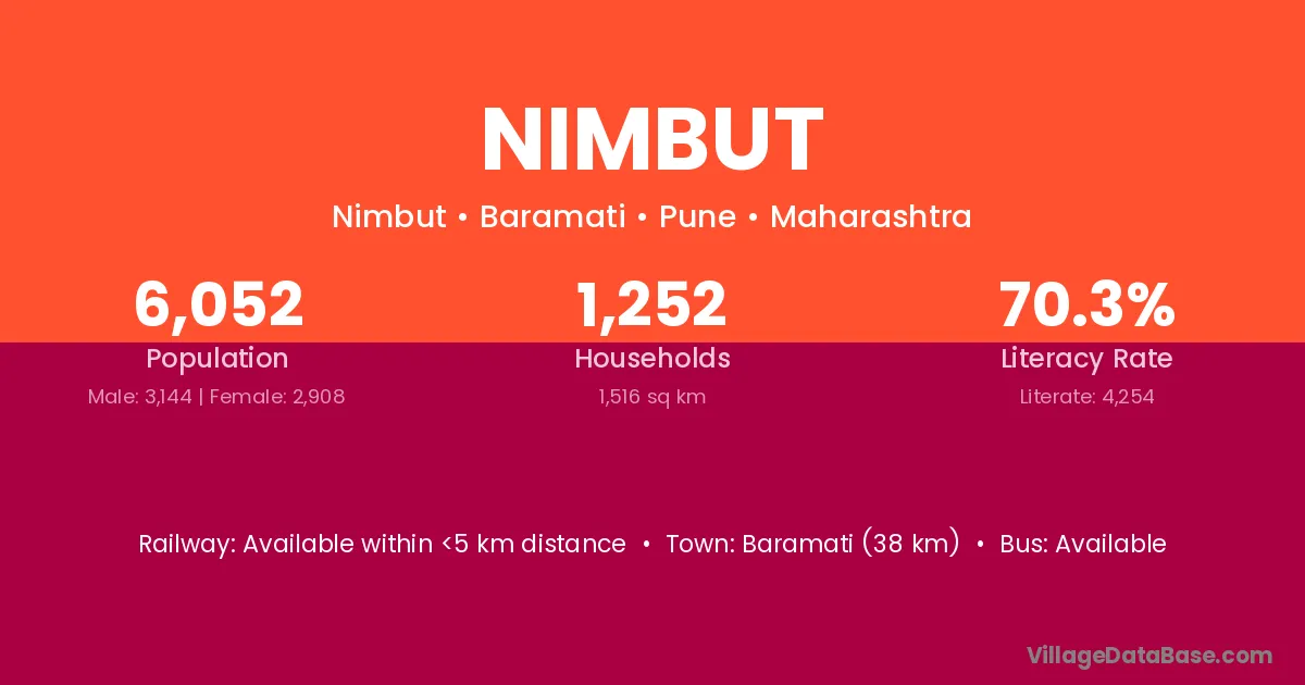 Baramati (38 km) is the nearest town to Nimbut village for major economic activities and is located approximately 38 km away.