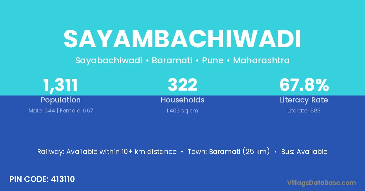 Baramati (25 km) is the nearest town to Sayambachiwadi village for major economic activities and is located approximately 25 km away.