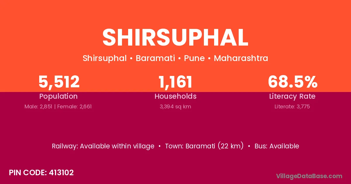 Baramati (22 km) is the nearest town to Shirsuphal village for major economic activities and is located approximately 22 km away.