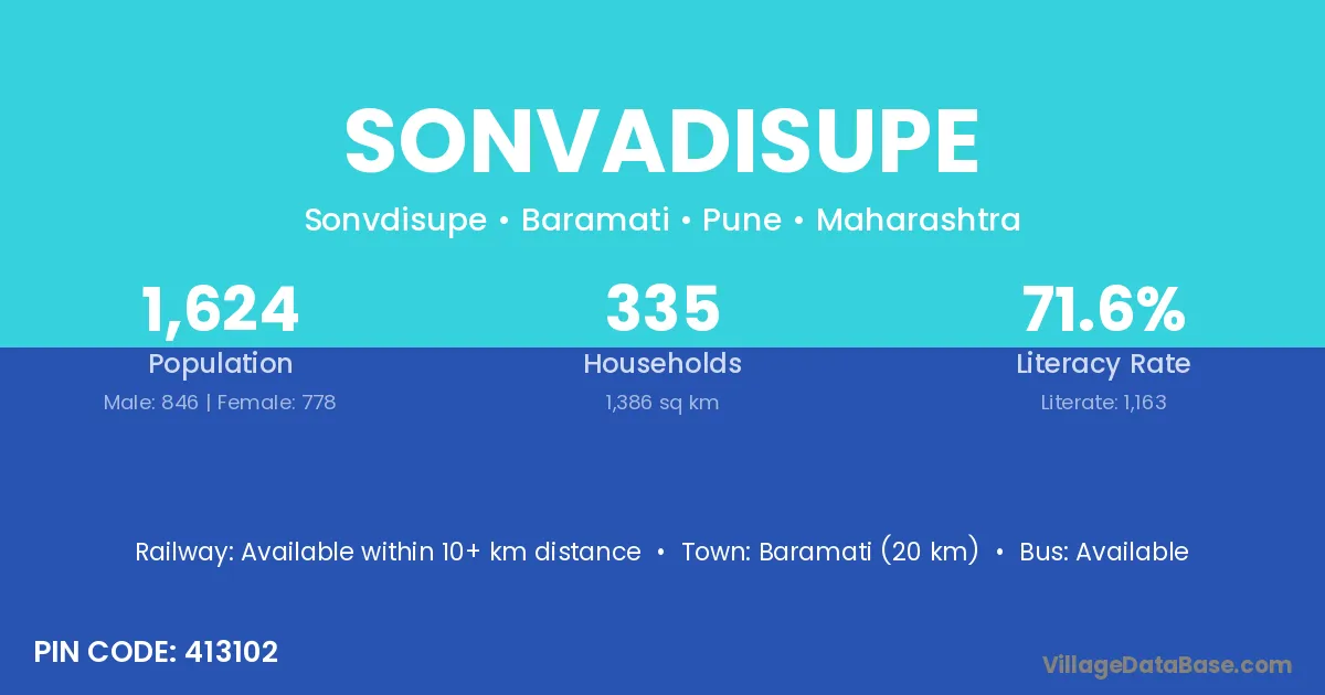 Baramati (20 km) is the nearest town to Sonvadisupe village for major economic activities and is located approximately 20 km away.