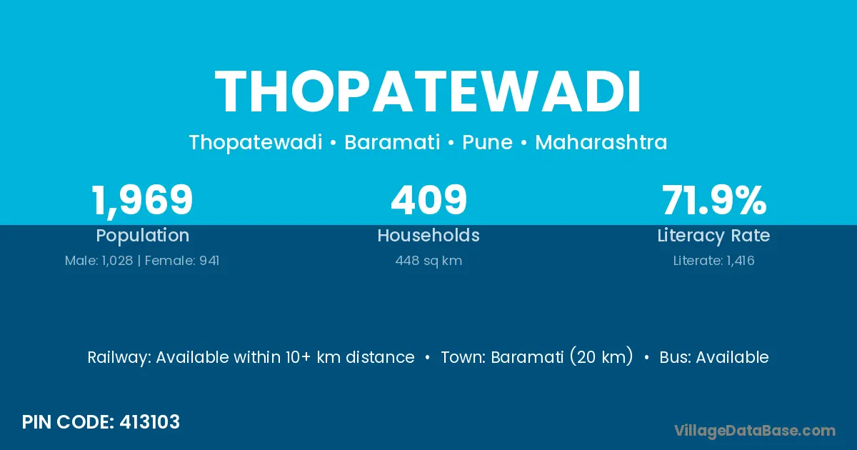 Baramati (20 km) is the nearest town to Thopatewadi village for major economic activities and is located approximately 20 km away.