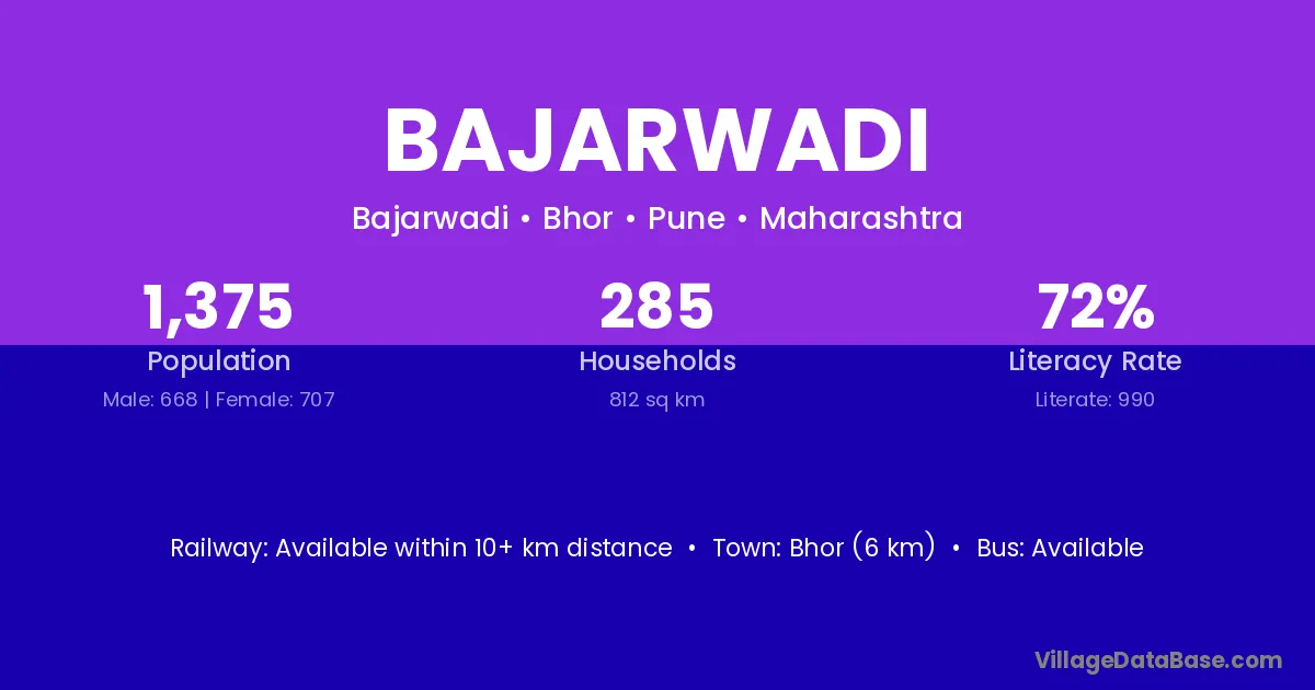 Bhor (6 km) is the nearest town to Bajarwadi village for major economic activities and is located approximately 6 km away.