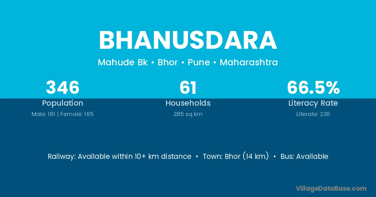 Bhor (14 km) is the nearest town to Bhanusdara village for major economic activities and is located approximately 14 km away.