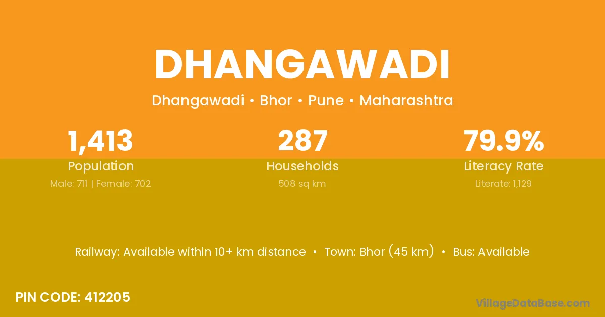 Dhangawadi village has a total population of 1,413 people, of which 711 are males and 702 are females.