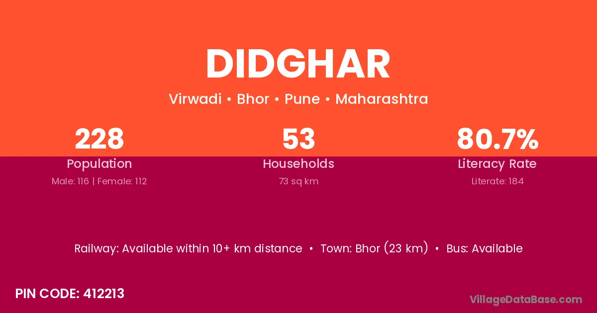Bhor (23 km) is the nearest town to Didghar village for major economic activities and is located approximately 23 km away.