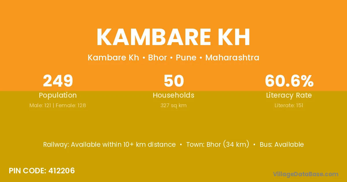 Bhor (34 km) is the nearest town to Kambare Kh village for major economic activities and is located approximately 34 km away.