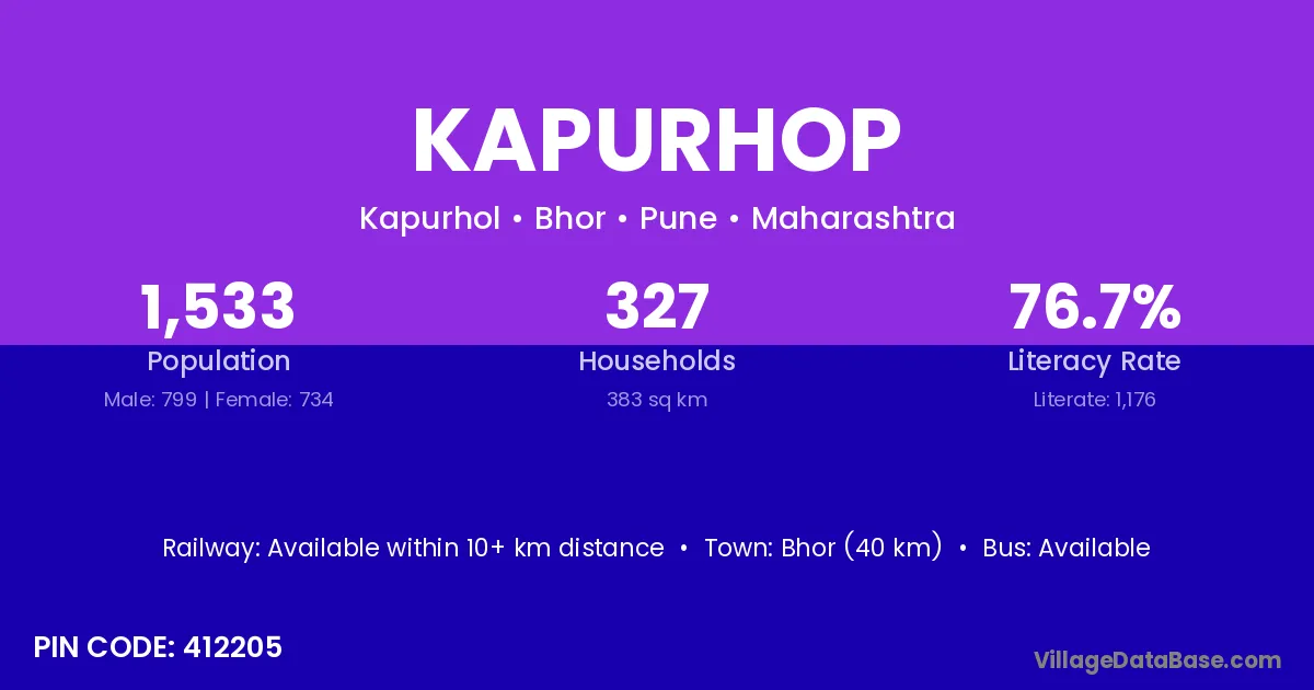 Bhor (40 km) is the nearest town to Kapurhop village for major economic activities and is located approximately 40 km away.