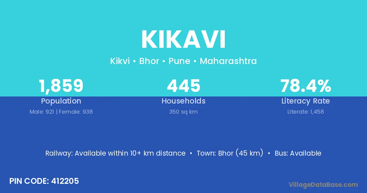 Bhor (45 km) is the nearest town to Kikavi village for major economic activities and is located approximately 45 km away.
