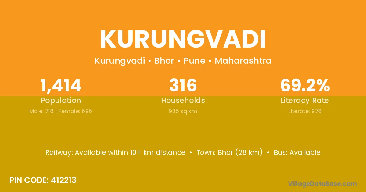 Bhor (28 km) is the nearest town to Kurungvadi village for major economic activities and is located approximately 28 km away.