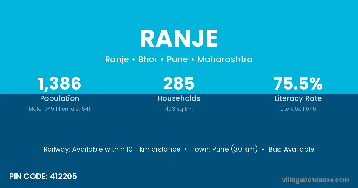 Pune (30 km) is the nearest town to Ranje village for major economic activities and is located approximately 30 km away.