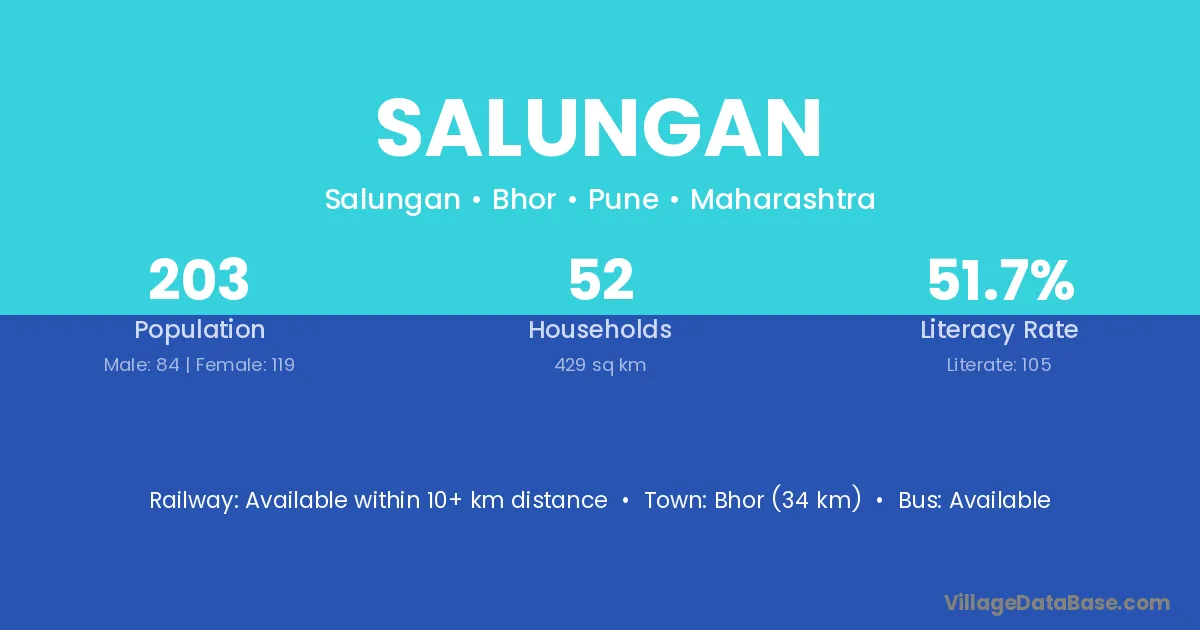 Bhor (34 km) is the nearest town to Salungan village for major economic activities and is located approximately 34 km away.