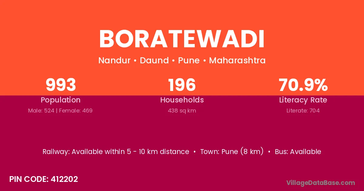 Boratewadi village has a total population of 993 people, of which 524 are males and 469 are females.