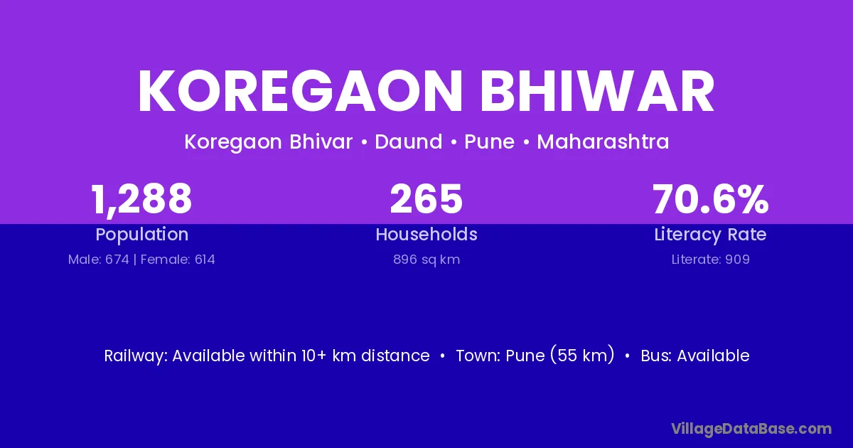 Pune (55 km) is the nearest town to Koregaon Bhiwar village for major economic activities and is located approximately 55 km away.