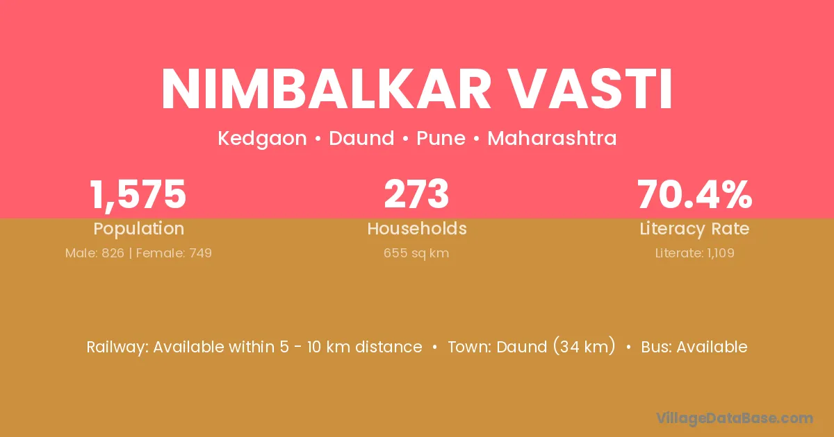 Daund (34 km) is the nearest town to Nimbalkar Vasti village for major economic activities and is located approximately 34 km away.