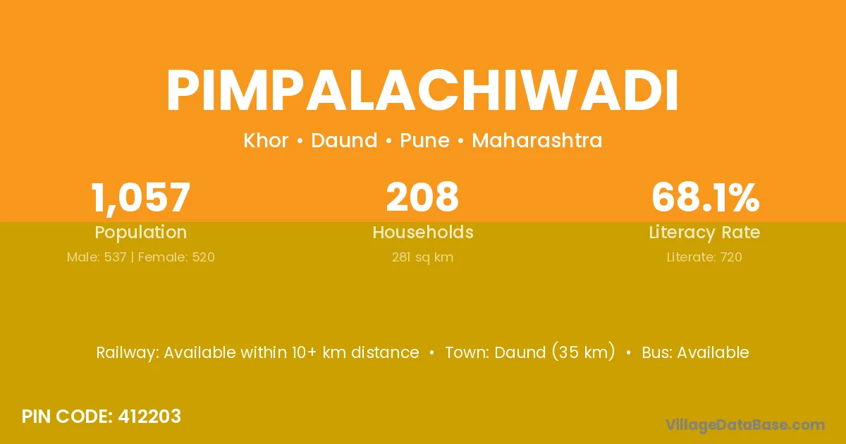 Pimpalachiwadi village has a total population of 1,057 people, of which 537 are males and 520 are females.