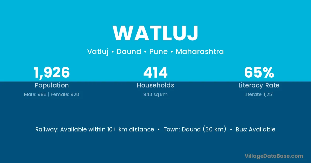 Daund (30 km) is the nearest town to Watluj village for major economic activities and is located approximately 30 km away.