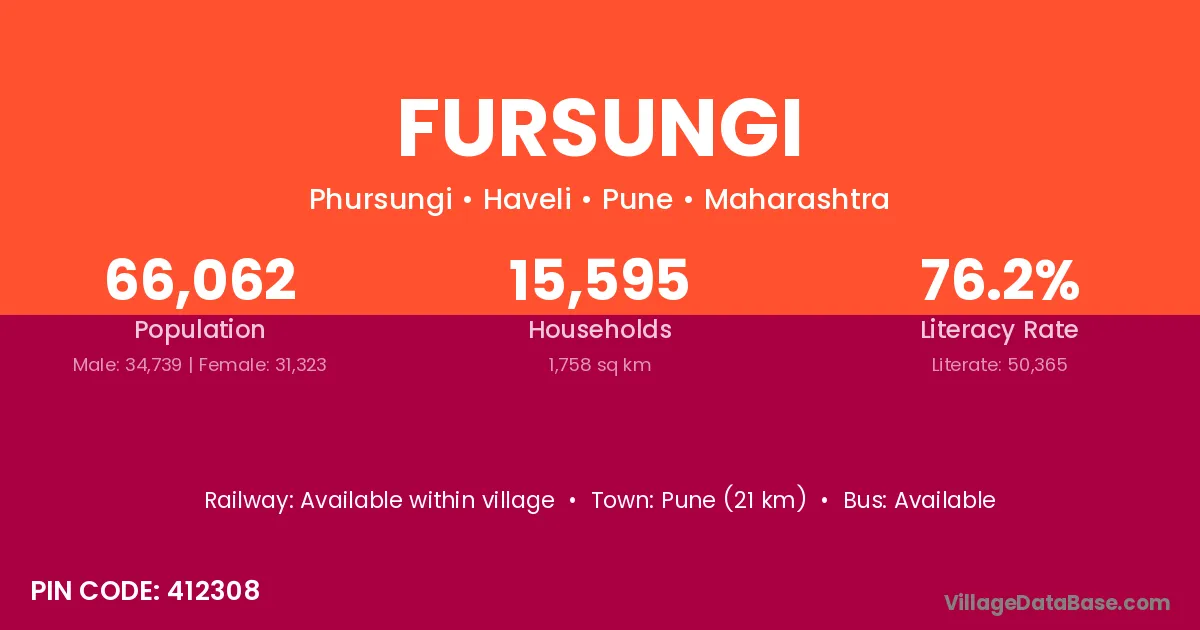 Pune (21 km) is the nearest town to Fursungi village for major economic activities and is located approximately 21 km away.