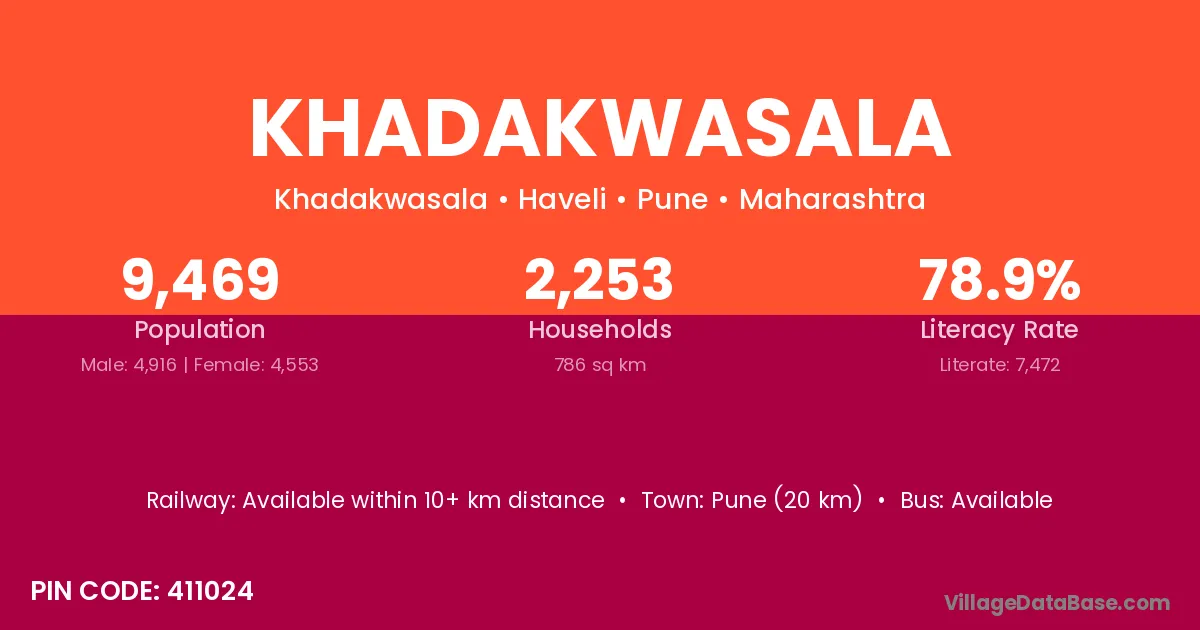 Khadakwasala village has a total population of 9,469 people, of which 4,916 are males and 4,553 are females.