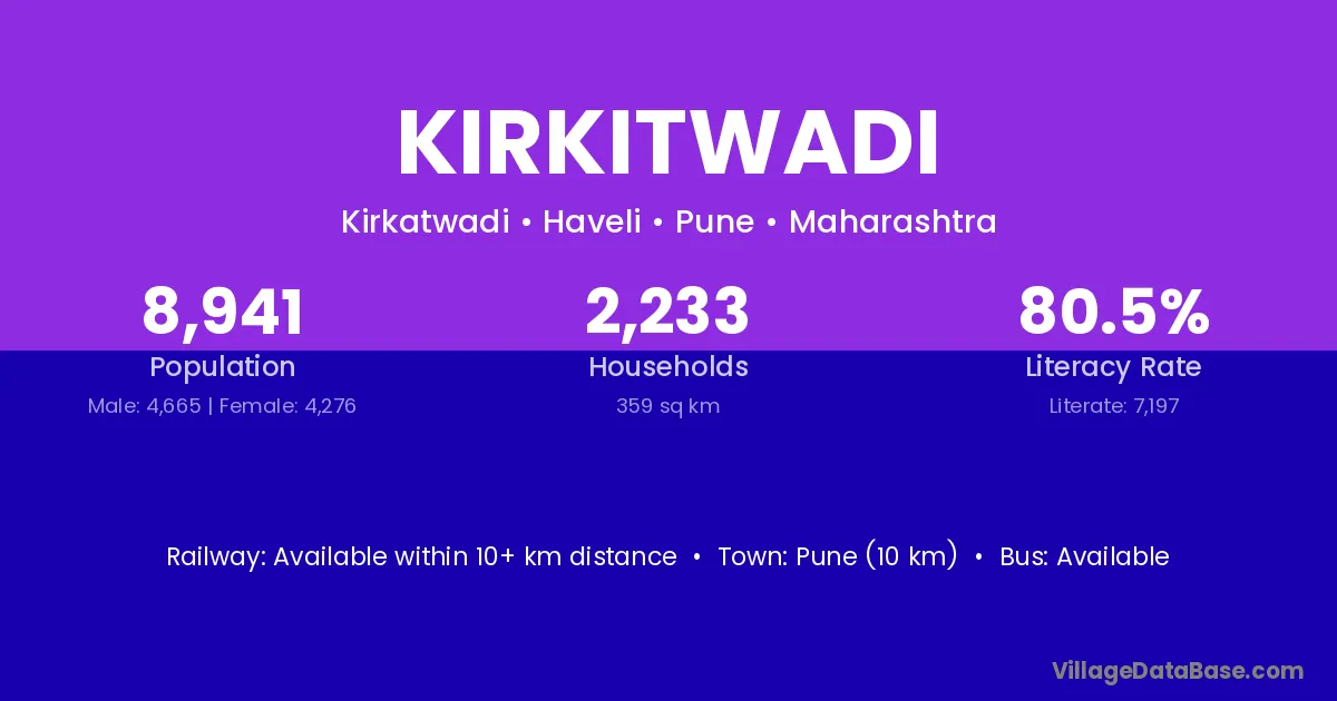 Kirkitwadi village has a total population of 8,941 people, of which 4,665 are males and 4,276 are females.