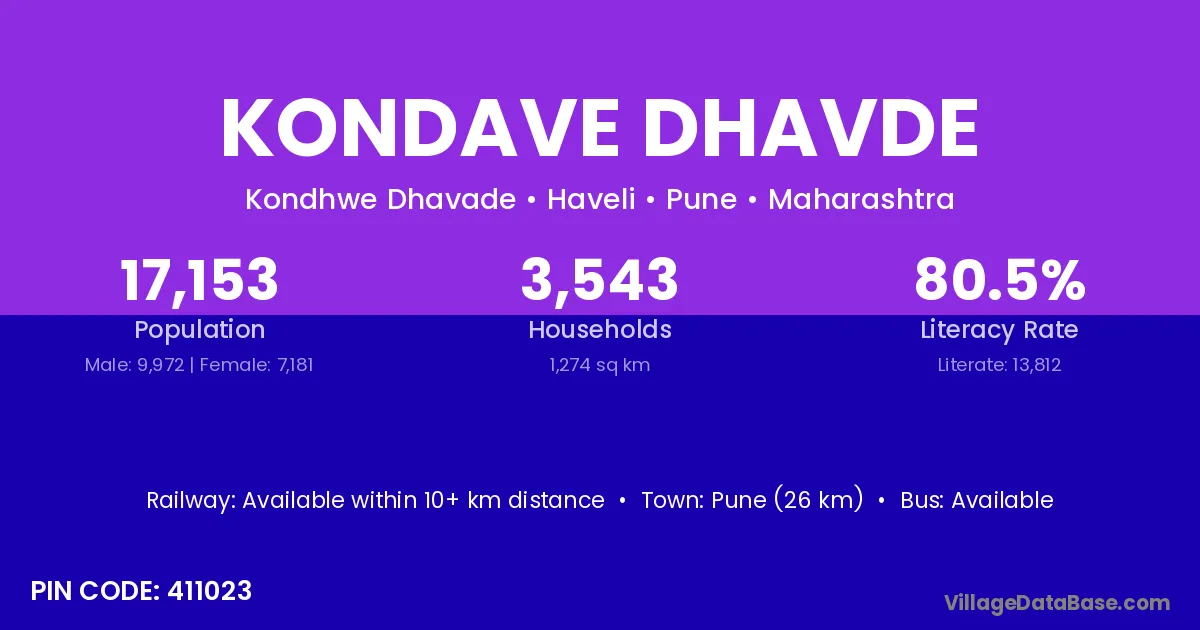 Pune (26 km) is the nearest town to Kondave Dhavde village for major economic activities and is located approximately 26 km away.