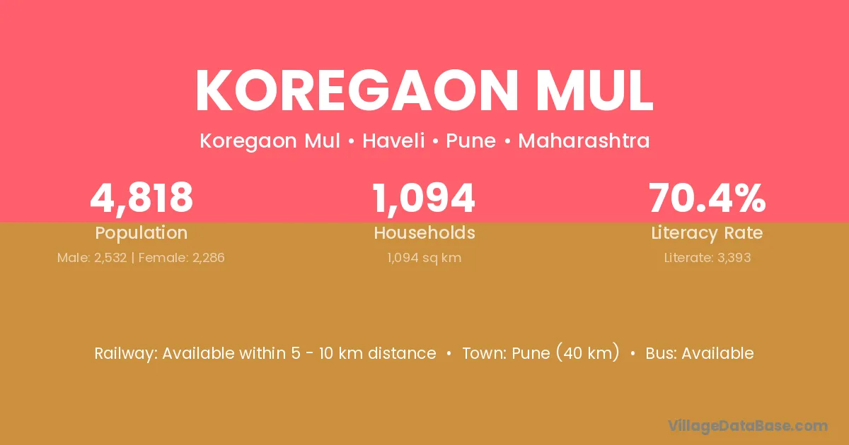 Koregaon Mul village has a total population of 4,818 people, of which 2,532 are males and 2,286 are females.
