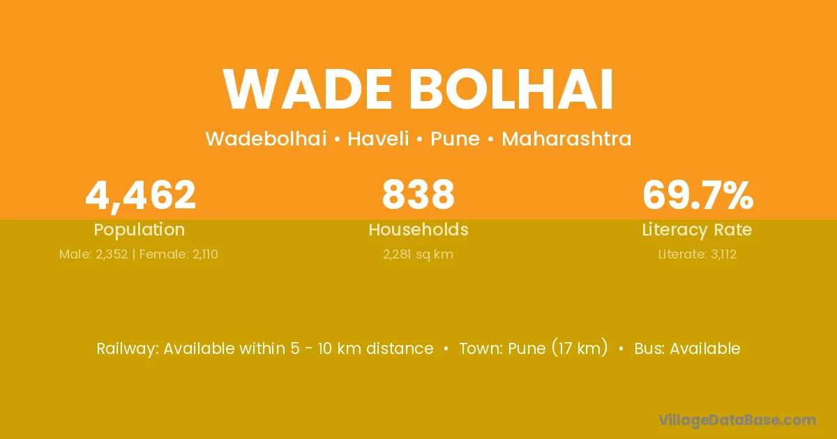 Pune (17 km) is the nearest town to Wade Bolhai village for major economic activities and is located approximately 17 km away.