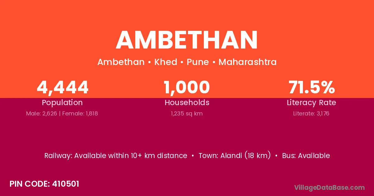 Alandi (18 km) is the nearest town to Ambethan village for major economic activities and is located approximately 18 km away.
