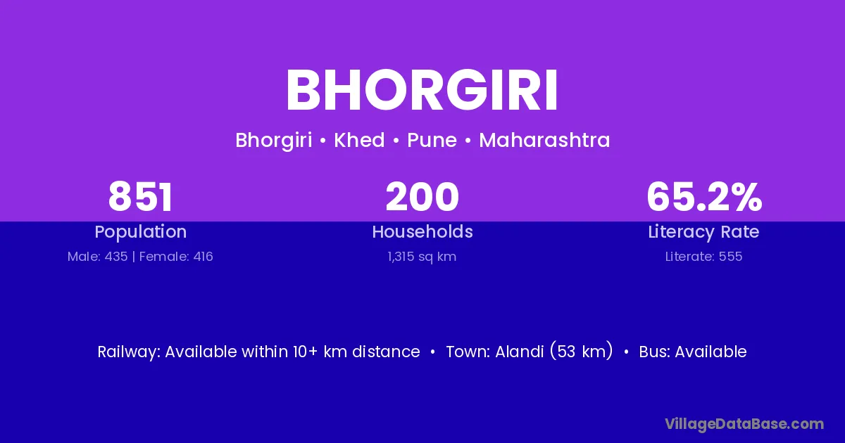 Alandi (53 km) is the nearest town to Bhorgiri village for major economic activities and is located approximately 53 km away.