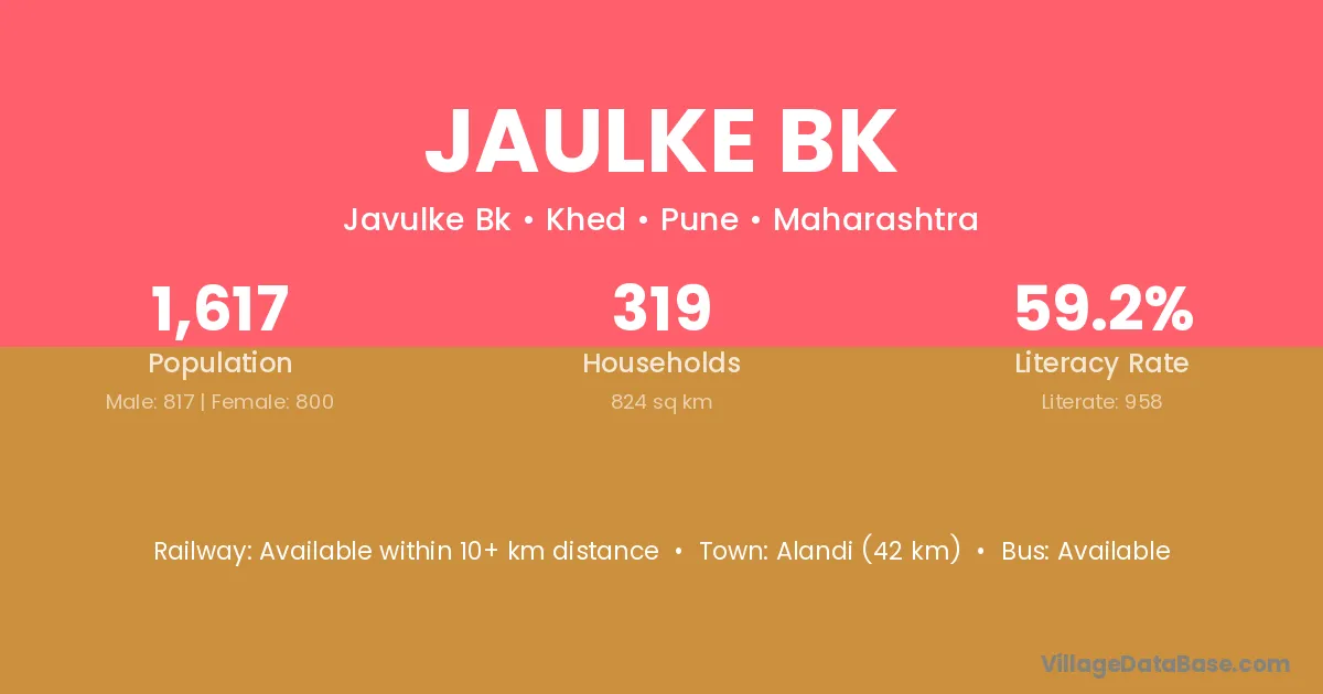 Alandi (42 km) is the nearest town to Jaulke Bk village for major economic activities and is located approximately 42 km away.