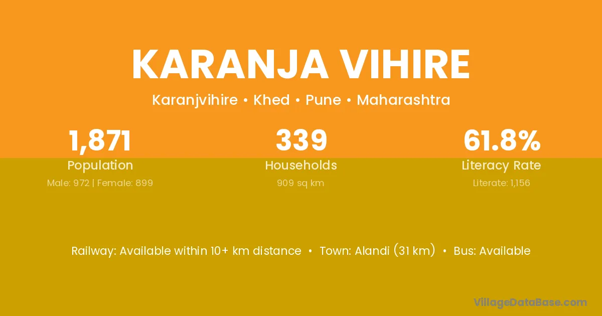 Alandi (31 km) is the nearest town to Karanja Vihire village for major economic activities and is located approximately 31 km away.