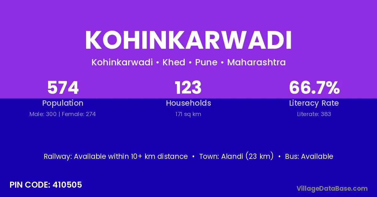 Alandi (23 km) is the nearest town to Kohinkarwadi village for major economic activities and is located approximately 23 km away.