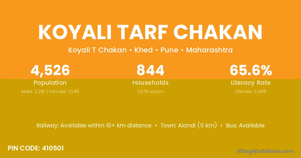 Alandi (11 km) is the nearest town to Koyali Tarf Chakan village for major economic activities and is located approximately 11 km away.
