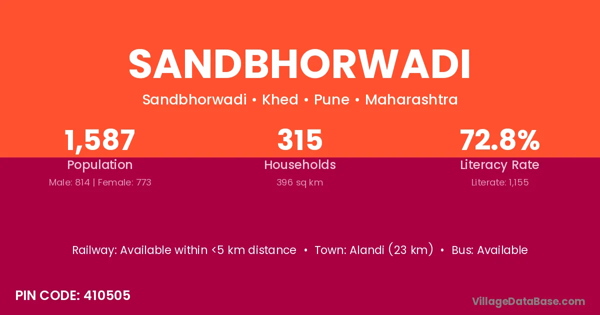 Alandi (23 km) is the nearest town to Sandbhorwadi village for major economic activities and is located approximately 23 km away.