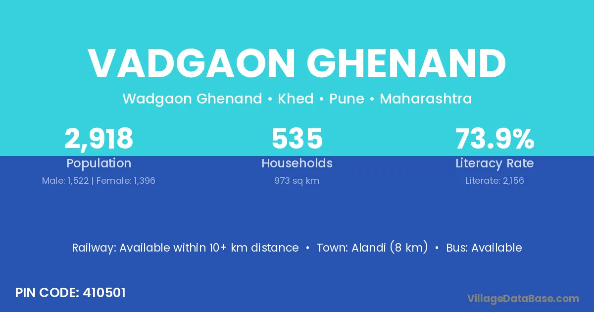Alandi (8 km) is the nearest town to Vadgaon Ghenand village for major economic activities and is located approximately 8 km away.
