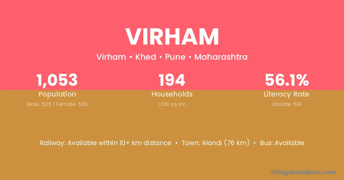 Alandi (76 km) is the nearest town to Virham village for major economic activities and is located approximately 76 km away.