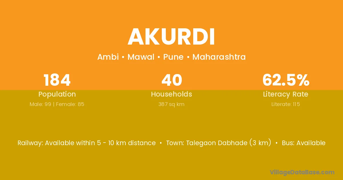 Talegaon Dabhade (3 km) is the nearest town to Akurdi village for major economic activities and is located approximately 3 km away.