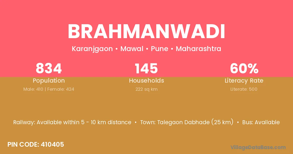 Brahmanwadi village has a total population of 834 people, of which 410 are males and 424 are females.