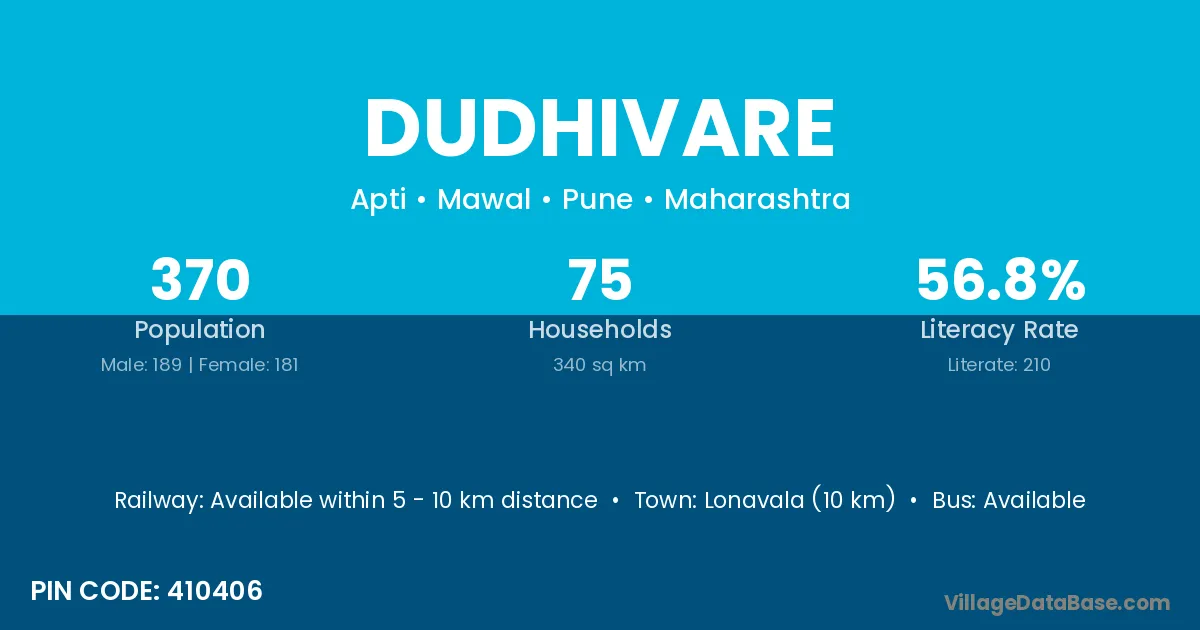 Lonavala (10 km) is the nearest town to Dudhivare village for major economic activities and is located approximately 10 km away.