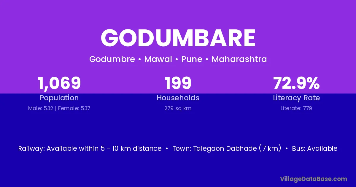 Talegaon Dabhade (7 km) is the nearest town to Godumbare village for major economic activities and is located approximately 7 km away.