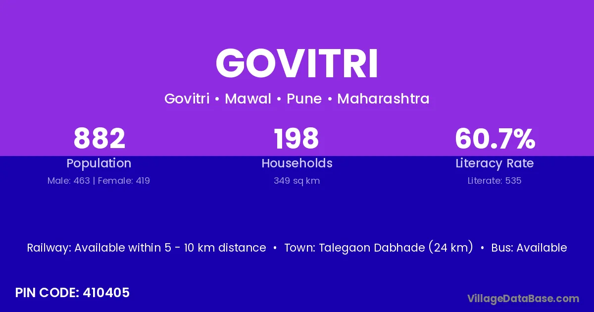 Talegaon Dabhade (24 km) is the nearest town to Govitri village for major economic activities and is located approximately 24 km away.
