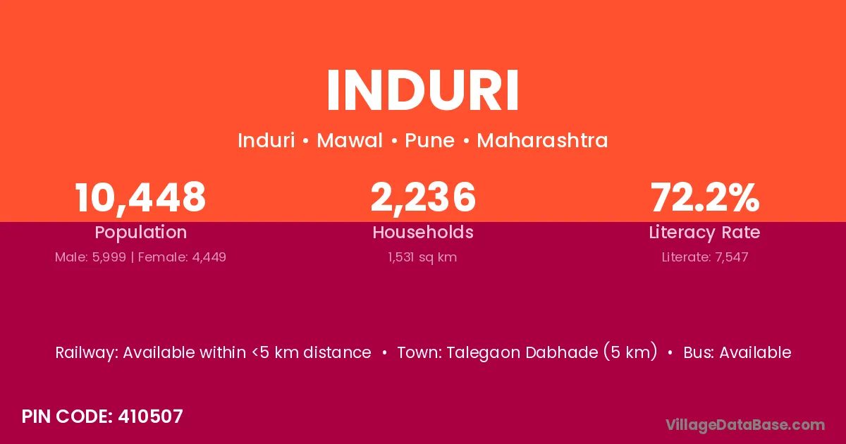 Talegaon Dabhade (5 km) is the nearest town to Induri village for major economic activities and is located approximately 5 km away.