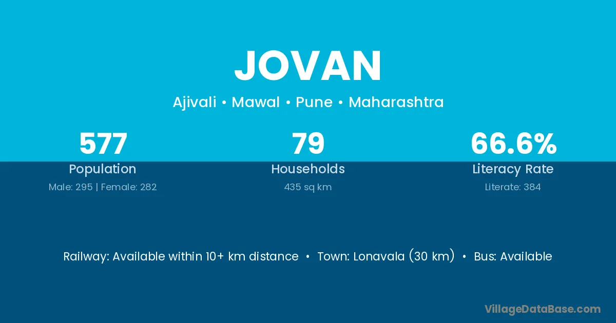 Lonavala (30 km) is the nearest town to Jovan village for major economic activities and is located approximately 30 km away.