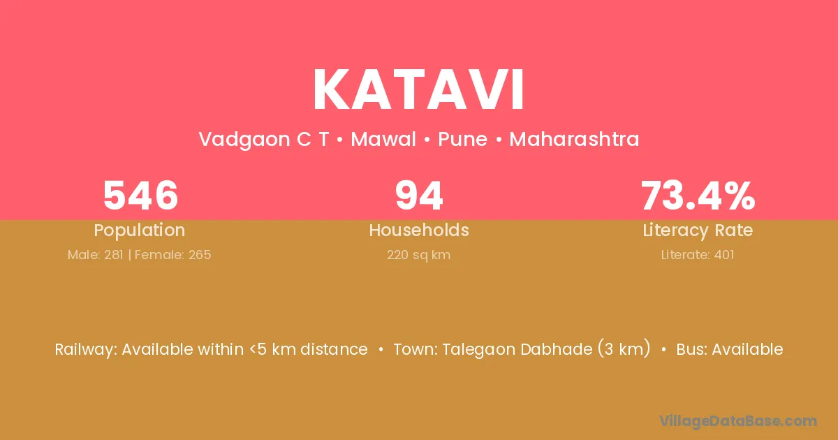 Talegaon Dabhade (3 km) is the nearest town to Katavi village for major economic activities and is located approximately 3 km away.