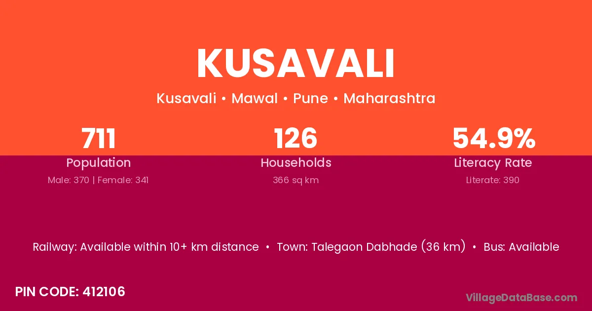 Talegaon Dabhade (36 km) is the nearest town to Kusavali village for major economic activities and is located approximately 36 km away.