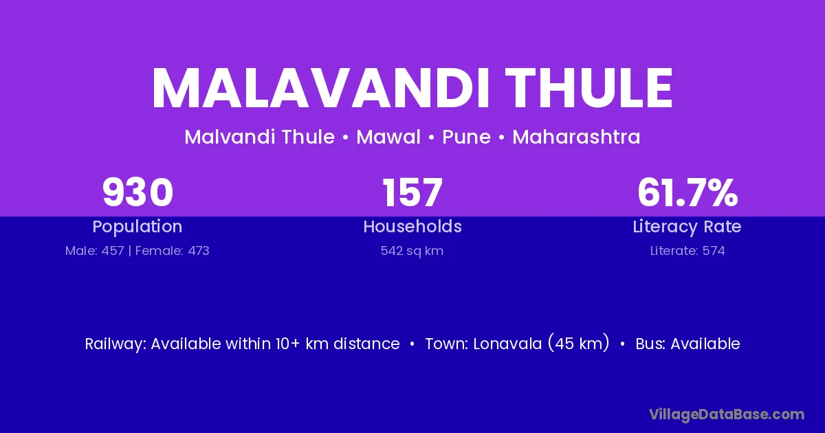 Lonavala (45 km) is the nearest town to Malavandi Thule village for major economic activities and is located approximately 45 km away.